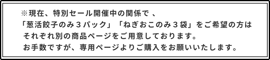 | 内容量 | 葱活餃子 320g(16個入)・ねぎおこ 271g(お好み焼き250g) いずれか3点 |