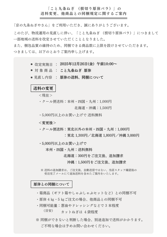 いつも「京の九条ねぎやさん」をご利用いただき、誠にありがとうございます。