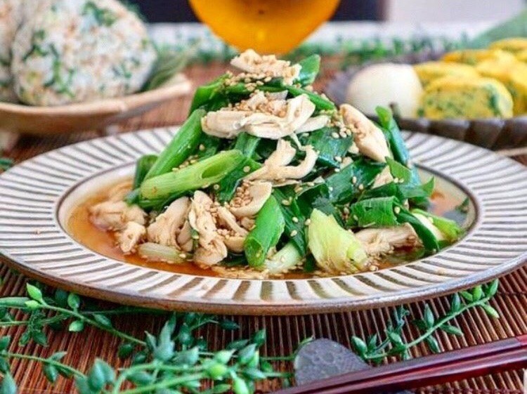 - 粗熱をとってからささみを大きめに手でさき、蒸し汁ごとボウルに入れ九条ねぎを加える