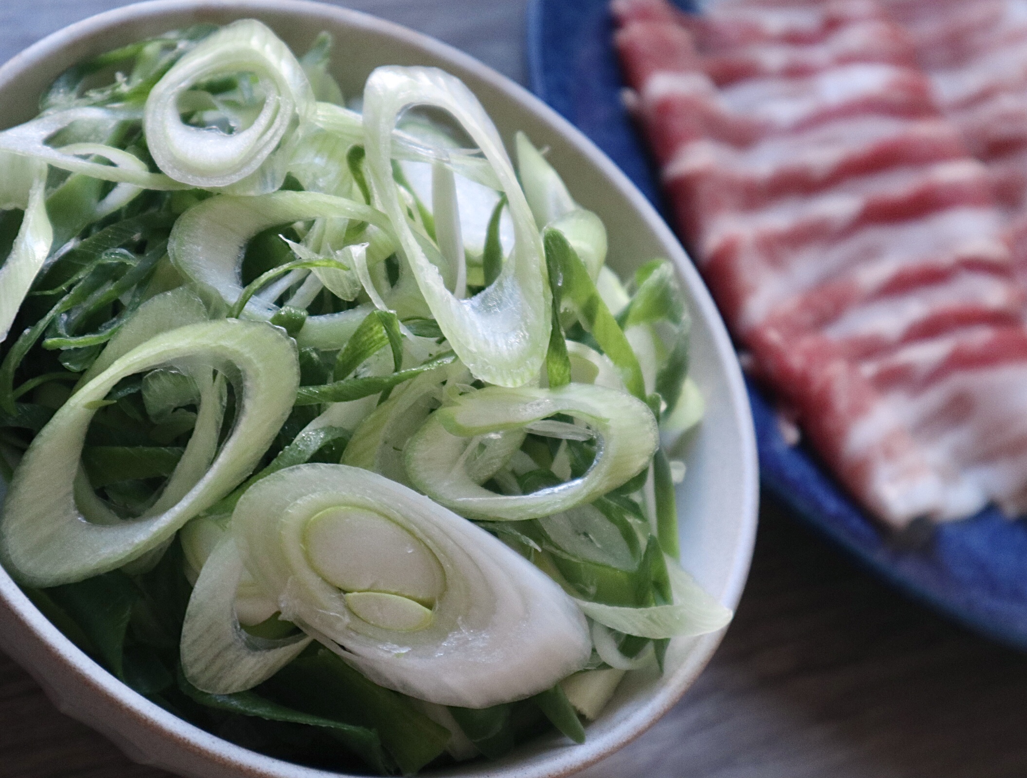 まっすぐに切ってしまうとネギの内側の部分がすっぽり抜けてしまうこともありますので、「大きめの斜め切り」がオススメ。